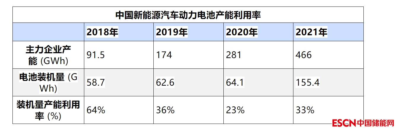目前,中國新能源汽車動力電池產(chǎn)能利用率偏低,2021年主力動力電池企業(yè)產(chǎn)能在年末達(dá)到466GWh,但裝機(jī)量需求155GWh,產(chǎn)能利用率只有33%。