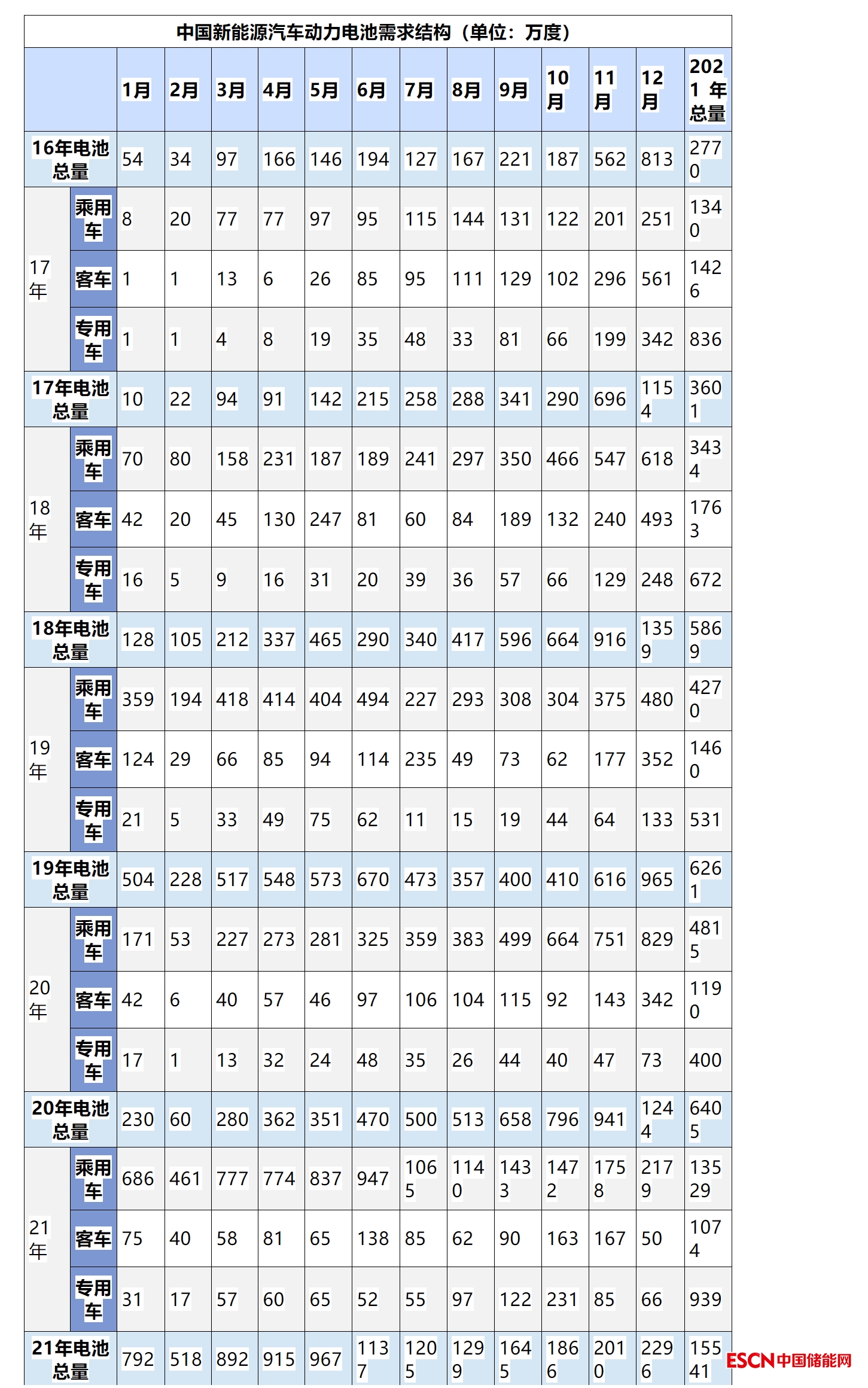 新能源汽車需求出現(xiàn)從客車為主的拉動轉(zhuǎn)移到乘用車為主的變化。2021年動力電池需求15542萬度,大幅好于2020年的動力電池6405萬度需求。隨著2019年新能源補(bǔ)貼退坡前后的干擾因素消失,2020年7-12月和2021年的的動力電池需求相對較強(qiáng)。