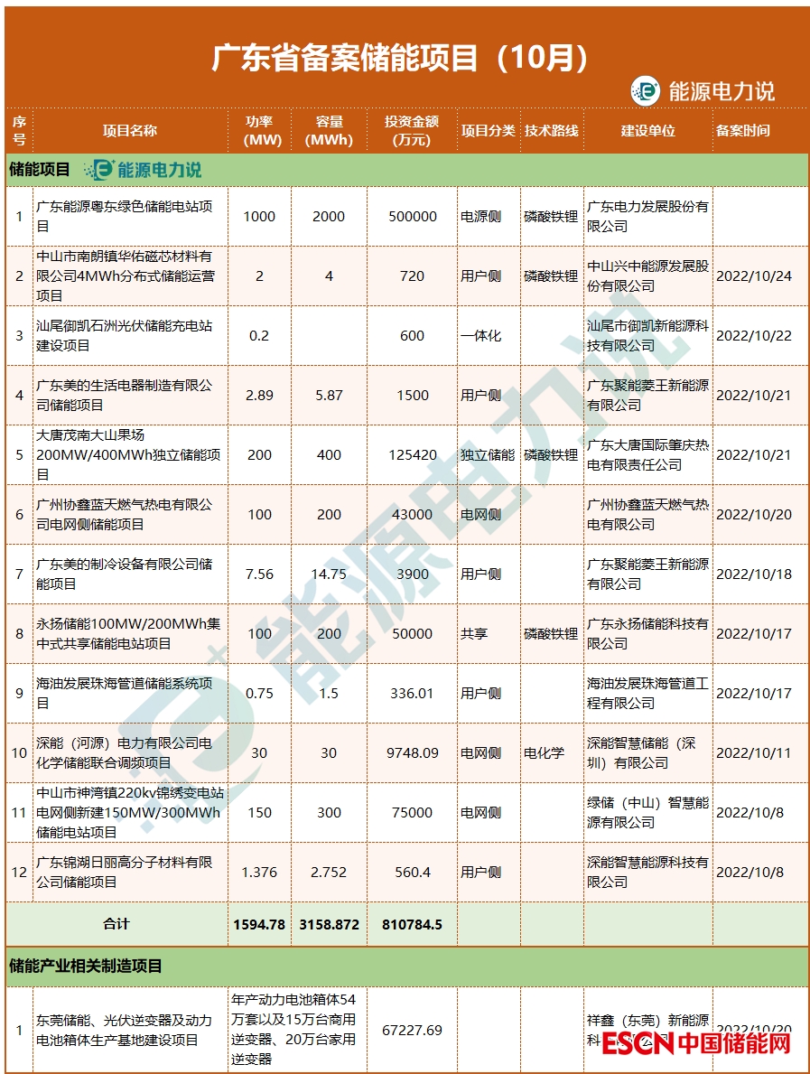 10月,廣東省備案儲能項(xiàng)目13個(gè),其中儲能項(xiàng)目12個(gè),儲能產(chǎn)品制造基地項(xiàng)目1個(gè)。