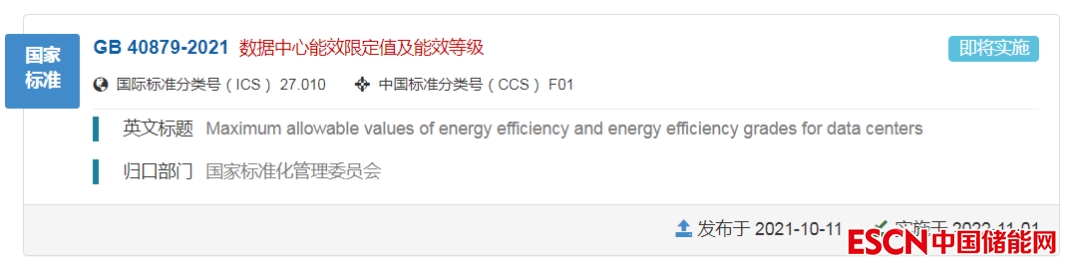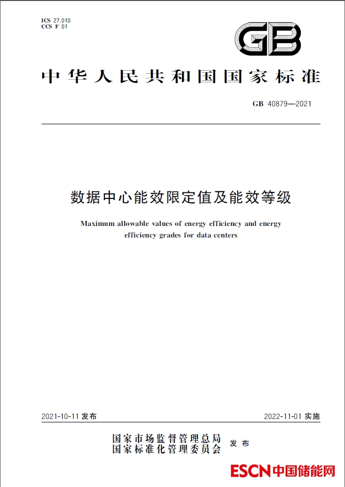 中國儲能網(wǎng)訊:據(jù)國家市場監(jiān)管總局(國家標(biāo)準(zhǔn)化管理委員會)網(wǎng)站消息,國家標(biāo)準(zhǔn)《數(shù)據(jù)中心能效限定值和能效等級》(GB 40879—2021)自2022年11月1日起在全國范圍強制實施。