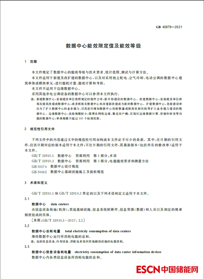《數(shù)據(jù)中心能效限定值和能效等級》(GB 40879—2021)于2021年10月11日發(fā)布,在當(dāng)天市場監(jiān)管總局召開“標(biāo)準(zhǔn)促進可持續(xù)發(fā)展”專題新聞發(fā)布會上,國家發(fā)展改革委環(huán)資司副司長劉瓊介紹:“數(shù)據(jù)中心作為傳輸、儲存、處理數(shù)據(jù)資源的新型基礎(chǔ)設(shè)施,近年來用電量隨著業(yè)務(wù)擴容增長迅猛,首次發(fā)布的《數(shù)據(jù)中心能效限定值及能效等級》建立了規(guī)范、統(tǒng)一的數(shù)據(jù)中心能效評價方法,規(guī)定了能效限定值等強制性能效準(zhǔn)入要求,將為該領(lǐng)域?qū)崿F(xiàn)綠色低碳發(fā)展提供關(guān)鍵的標(biāo)準(zhǔn)工具?!?