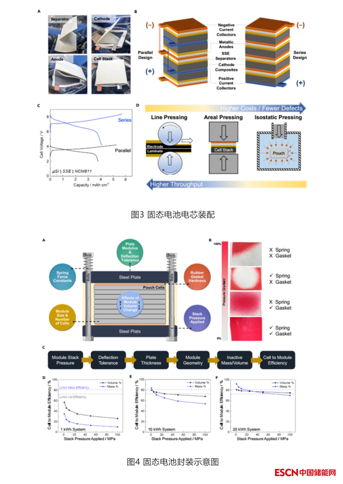 近日由LG能源公司資助的芝加哥大學(xué)的一項(xiàng)研究重點(diǎn)從全固態(tài)電池材料、電極、電芯制造等角度出發(fā),討論了固態(tài)電池規(guī)?;a(chǎn)所面臨的挑戰(zhàn),并針對(duì)挑戰(zhàn)提出了一些潛在的解決方案。第一,材料方面的挑戰(zhàn)主要是固態(tài)電解質(zhì),根據(jù)阿貢實(shí)驗(yàn)室研究現(xiàn)階段Li6PS5Cl 價(jià)格是常規(guī)液態(tài)電解液與隔膜之和100倍。其中主要的因素是沒(méi)有規(guī)?;瘜?shí)現(xiàn)量產(chǎn),且現(xiàn)階段的合成工藝需要進(jìn)一步優(yōu)化,進(jìn)一步降低合成材料所需要的時(shí)間,如針對(duì)硫化物固態(tài)電解質(zhì)的合成,可通過(guò)固相反應(yīng)將反應(yīng)時(shí)間由48h降低至1~3h,使用非極性溶劑如二甲苯或甲苯進(jìn)行濕法球磨有助于進(jìn)一步優(yōu)化固態(tài)電解質(zhì)粒徑及其分布;關(guān)于電解質(zhì)帶來(lái)的另外一個(gè)挑戰(zhàn)主要是生產(chǎn)環(huán)境的要求,以硫化物固態(tài)電解質(zhì)為例,通常認(rèn)為對(duì)生產(chǎn)制造環(huán)境要求較為苛刻,實(shí)驗(yàn)室中一般要求在惰性氣氛下進(jìn)行,而研究表明Li6PS5Cl在-40℃露點(diǎn)下性能能夠很好的保證,實(shí)際上與常規(guī)液態(tài)電解液要求的使用環(huán)境相差并不大。第二,固態(tài)電解質(zhì)隔膜和厚電極的加工,以正極為例,如果使用硫化物固態(tài)電解質(zhì)可以使用非極性溶劑作為溶劑按照濕法電極的制作工藝進(jìn)行制備,但是濕法工藝難以滿(mǎn)足厚電極加工需求,通過(guò)干法電極工藝能夠有效提升厚電極的加工,采用干法電極有兩方面優(yōu)勢(shì),一,降低溶劑使用避免了烘烤,有利于成本的降低;二,干法工藝能夠有效提升電極致密性,有利于體積能量密度的提升,同時(shí)提高了活性物質(zhì)和固態(tài)電解質(zhì)的接觸,提高鋰離子傳導(dǎo)性能。同理可以采用同樣工藝對(duì)膜或負(fù)極進(jìn)行加工。第三,單電芯的組裝,可以采用常規(guī)軟包電芯組裝方式進(jìn)行組裝,如卷繞、Z型疊片等方式進(jìn)行組裝,但對(duì)膜的強(qiáng)度要求較高,現(xiàn)階段無(wú)法完全依靠固態(tài)電解質(zhì)膜達(dá)到相應(yīng)要求,固態(tài)電池可以?xún)?nèi)用內(nèi)部串聯(lián)的方式進(jìn)行組裝以獲取更高的能量密度。第四,電池單元的封裝,目前電池單元的封裝是全固態(tài)電池生產(chǎn)的主要限制因素,仍然需要更多的探索研究,甚至使用AI技術(shù)進(jìn)行研究。公開(kāi)報(bào)道為了保障電池內(nèi)部良好的界面,采用鋰金屬電池通常組裝壓力需要達(dá)到1~7MPa,而對(duì)于硅基或者石墨類(lèi)負(fù)極的全固態(tài)電池組裝壓力需要達(dá)到50-200MPa。