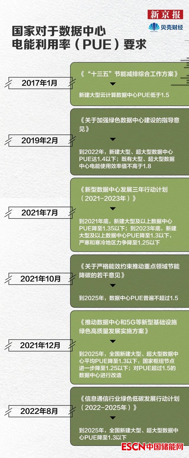 2017年,《“十三五”節(jié)能減排綜合工作方案》提出,新建大型云計(jì)算數(shù)據(jù)中心PUE值低于1.5。2021年12月,國家發(fā)改委四部門發(fā)布新政提出,到2025年,全國新建大型、超大型數(shù)據(jù)中心平均PUE值降至1.3以下,國家樞紐節(jié)點(diǎn)還將進(jìn)一步降至1.25以下。