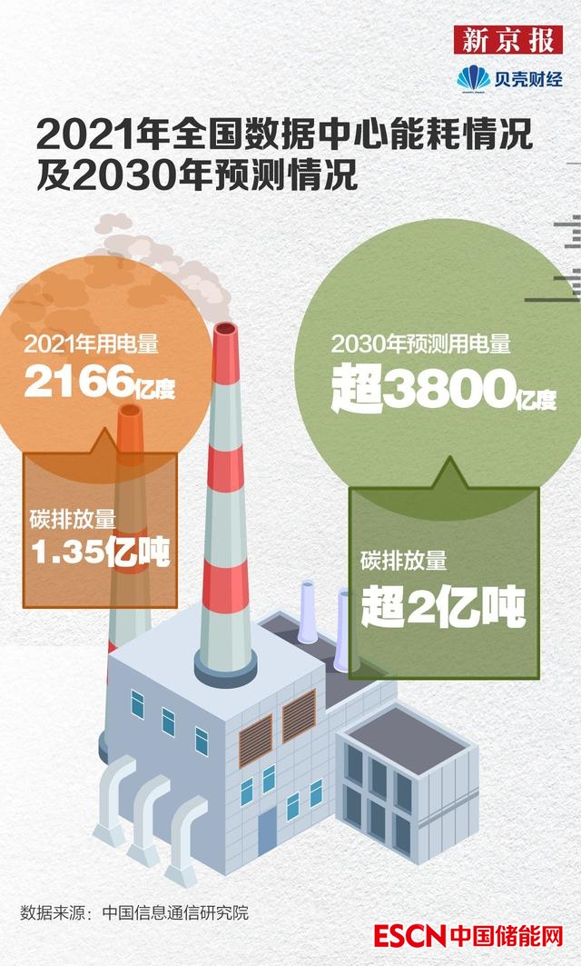 2021年,全國數(shù)據(jù)中心耗電量達(dá)2166億度,約占全國總耗電量的2.6%,是北京全年用電量的1.8倍。全國數(shù)據(jù)中心碳排放量達(dá)1.35億噸,占全國二氧化碳排放量的1.14%左右。