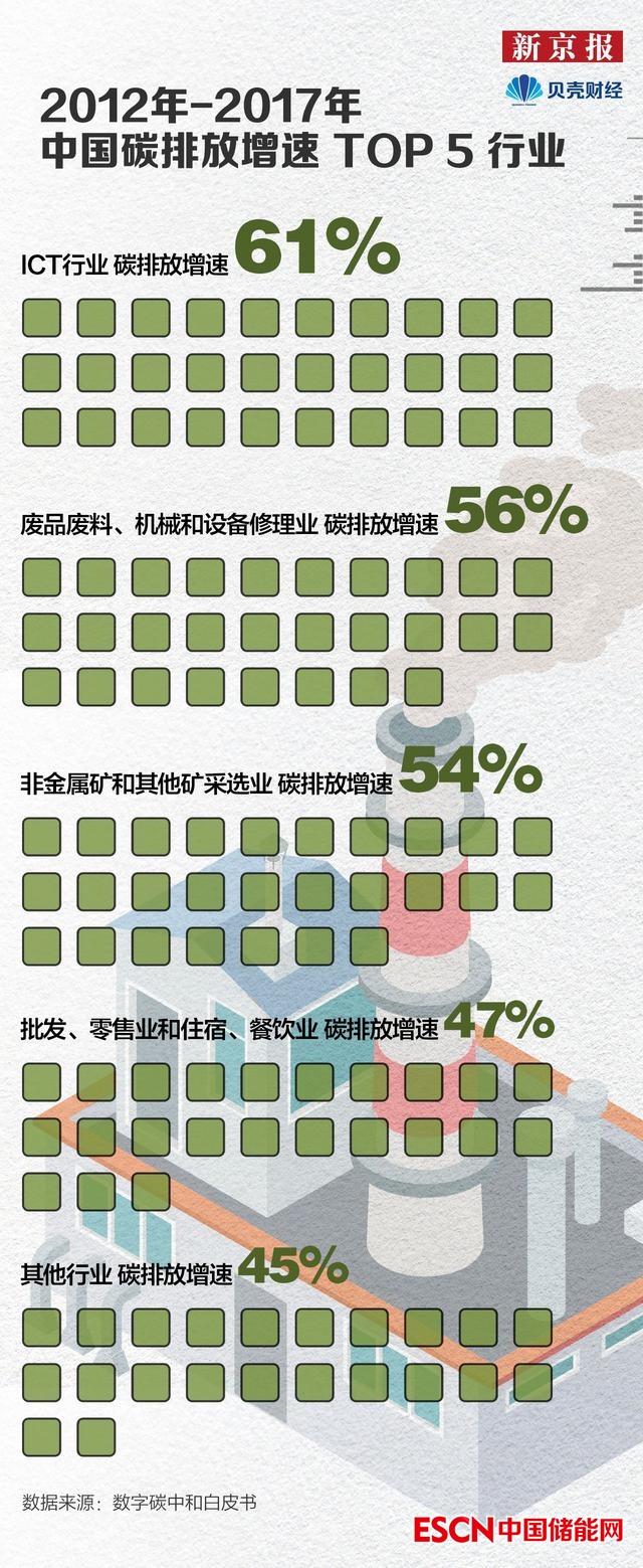 隨著數(shù)字化進(jìn)程不斷加深,包含數(shù)據(jù)中心、信息通信網(wǎng)絡(luò)等產(chǎn)業(yè)的ICT行業(yè)碳排放快速增長。2012年至2017年,ICT行業(yè)碳排放增長61%,成為漲幅最高的產(chǎn)業(yè),其中數(shù)據(jù)中心和5G基站能耗較快增長。