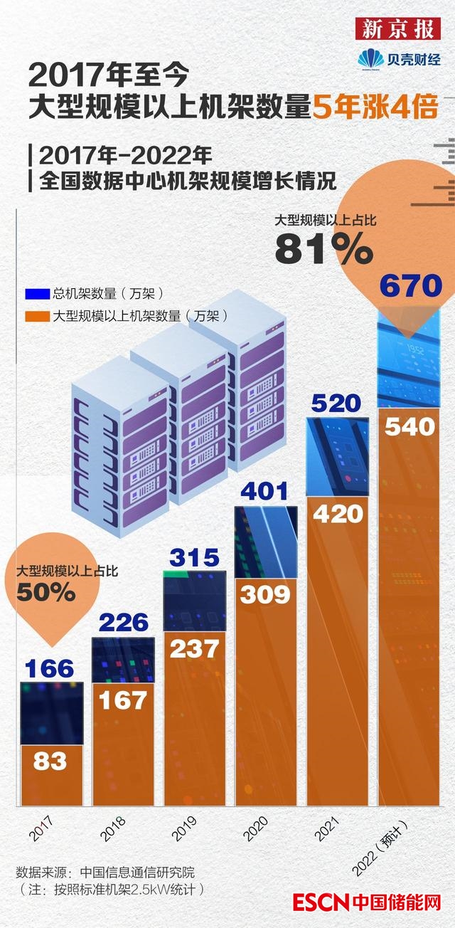 我國數(shù)據(jù)中心行業(yè)市場進(jìn)入高速發(fā)展階段,大型規(guī)模以上機(jī)架數(shù)量增長迅速。近5年,數(shù)據(jù)中心機(jī)架數(shù)量從166萬架增至520萬架,年均復(fù)合增速超30%,大型規(guī)模以上機(jī)架數(shù)量從2017年的83萬架增至2021年的420萬架,總占比提升至80.8%。據(jù)信通院測算,2022年全國機(jī)架規(guī)模將持續(xù)增長,大型以上機(jī)架數(shù)量將增至540萬架。