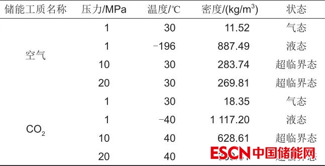 為了進(jìn)一步提高儲能系統(tǒng)的儲能效率與能量密度,相關(guān)學(xué)者提出了以CO2為工質(zhì)的二氧化碳儲能(carbon dioxide energy storage,CES)系統(tǒng),由于CO2臨界點(diǎn)(7.39 MPa和31.4 ℃)相對空氣(3.77 MPa和-140.5 ℃)容易達(dá)到,無毒、不易燃、安全等級為A1,且超臨界二氧化碳(S-CO2)具有優(yōu)良的熱力學(xué)性質(zhì):黏度小、密度大、導(dǎo)熱性能好,系統(tǒng)寄生能耗也相對較低。基于常規(guī)儲能設(shè)計參數(shù),表1展示了不同壓力和對應(yīng)溫度下空氣和CO2的密度大小,可以看出,相同狀態(tài)和壓力下CO2儲存密度均大于空氣,其中液態(tài)儲存時最高,從而使得CES系統(tǒng)具有較高的儲能潛力。