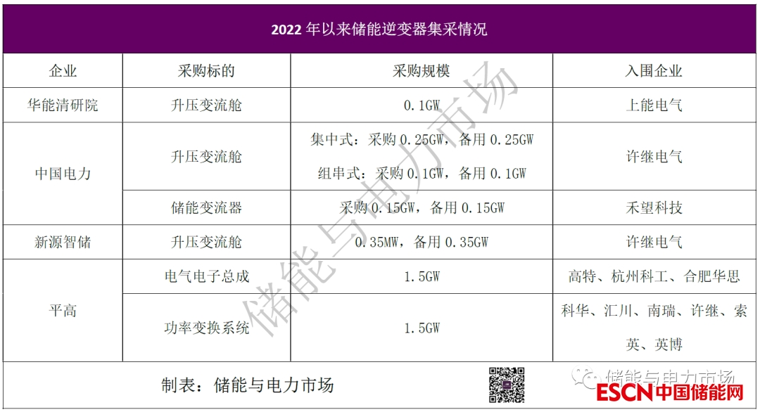 在逆變器方面,開(kāi)展集采的企業(yè)與電池簇較為一致,均是為了滿足內(nèi)部系統(tǒng)集成的需求,不含備用,涉及的采購(gòu)規(guī)模達(dá)3.95GW。2022年以來(lái)儲(chǔ)能逆變器集采情況如下表。