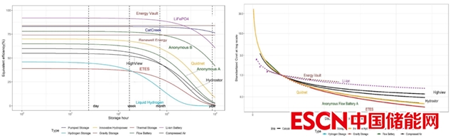 對不同長時儲能進(jìn)行進(jìn)行了對比,主要通過占地面積、部署靈活性、效率、投資成本等幾個方面對不同的長時儲能技術(shù)進(jìn)行了討論。其中部署靈活和占地面積方面,認(rèn)為抽水蓄能受到的限制較多,另外壓縮空氣儲能技術(shù)也存在相關(guān)問題。從效率指標(biāo)來看,鋰離子電池幾乎是最高的,但鋰離子電池功率單元能能量單元解耦比較困難,隨著系統(tǒng)不斷增大,電池?zé)峁芾硖魬?zhàn)越來越高,超過一定時間后效率會下降,在季節(jié)性時間尺度上,基于物理的電力存儲技術(shù)(如重力和PSH)具有相對較高的效率和低怠速損耗,甚至超越鋰離子電池。其中熱儲能技術(shù),效率取決于絕熱技術(shù),目前項(xiàng)目部署的主要時間尺度有較低,在大多數(shù)熱力系統(tǒng)的估計損失為3–10%每周,關(guān)于氫器存儲和運(yùn)輸在現(xiàn)階段均存在較大的問題,以液氫為例,幾乎每天的蒸發(fā)量可達(dá)5%左右。從成本上來,鋰離子電池在4h以下系統(tǒng)中具備較大競爭力,隨著時間的延長,儲熱、重力儲能、抽水蓄能、液流電池的優(yōu)勢逐漸顯現(xiàn)出來。