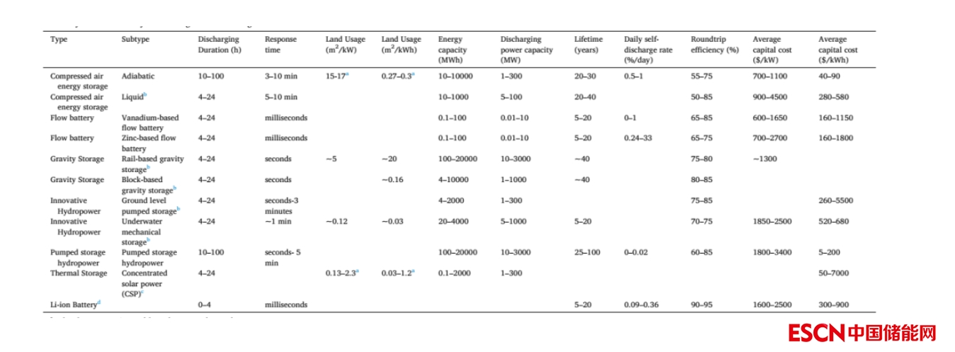 普遍認(rèn)為可以滿足長時儲能條件的儲能技術(shù)主要有:抽水蓄能、壓縮空氣儲能、液流電池以及其它新型電力儲能技術(shù),通常在長時儲能技術(shù)中并不包括鋰離子電池儲能技術(shù),典型長時儲能技術(shù)指標(biāo)如下表所示。與常規(guī)的短時儲能相比,這些LDES技術(shù)不僅僅在放電時間上存在差異,系統(tǒng)在設(shè)計和基本特性上也有顯著差異,許多LDES技術(shù)的應(yīng)用涉及電力、運(yùn)輸、供熱等多個領(lǐng)域。評估這些儲能技術(shù)的技術(shù)經(jīng)濟(jì)性面臨很多障礙,基于一手?jǐn)?shù)據(jù)北卡羅來納大學(xué)學(xué)者對新興的LDES技術(shù)進(jìn)行了對比,并對一些應(yīng)用案例進(jìn)行了討論。