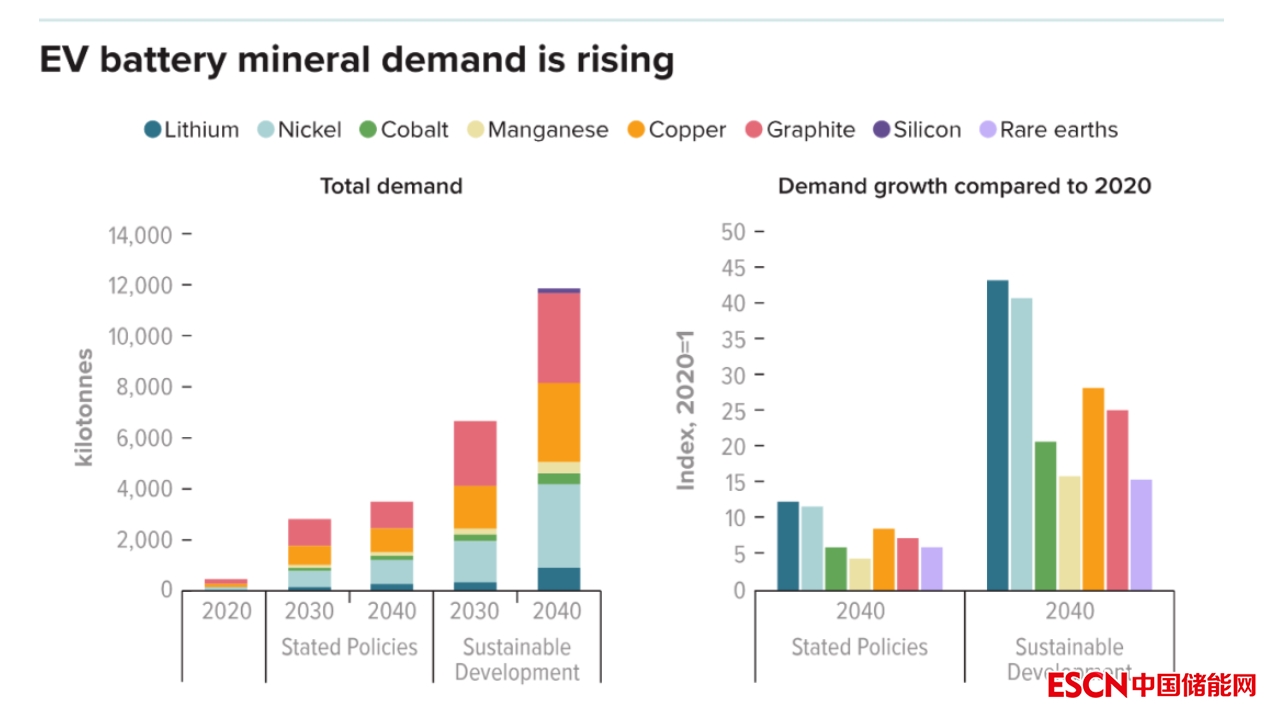 國(guó)際能源署預(yù)計(jì),為了實(shí)現(xiàn)將全球氣溫上升幅度控制在遠(yuǎn)低于2攝氏度(可持續(xù)發(fā)展方案)的碳排放削減目標(biāo),針對(duì)幾種關(guān)鍵礦物的需求將會(huì)激增。如果各國(guó)只是按照目前的承諾(既定政策)采取行動(dòng),需求同樣會(huì)增加,只是增速較小。