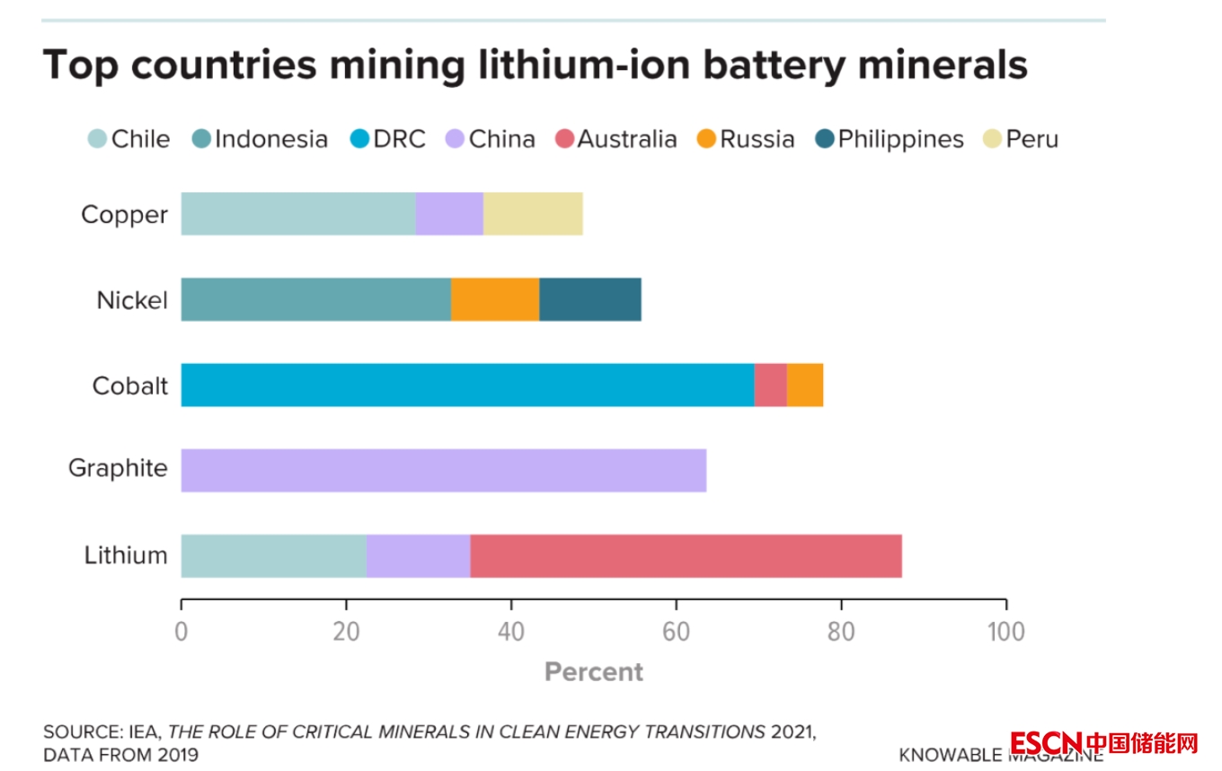 所有這些金屬都必須提取出來(lái),而且僅靠回收還不能滿(mǎn)足市場(chǎng)需求。盡管美國(guó)有很多銅礦(并從廢品回收中獲得相當(dāng)大一部分銅),但鋰離子電池中幾乎所有的其他金屬都來(lái)自其他國(guó)家的礦區(qū)。全球80%以上的鋰來(lái)自智利、澳大利亞和中國(guó),而60%以上的鈷來(lái)自剛果民主共和國(guó)。