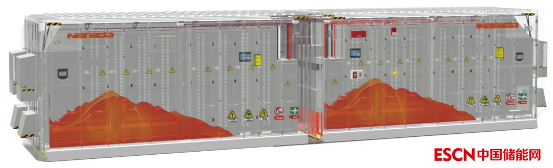 “該款產品在預裝式基礎上,采用重量輕、可現(xiàn)場并柜的20尺拼接集裝箱方案。相較于行業(yè)內40尺標準集裝儲能系統(tǒng)單位,面積能量密度提升84%?!蹦隙寄茉纯偣こ處熥T建國介紹。