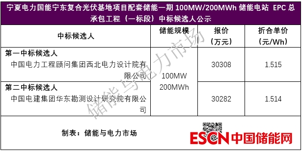 中國(guó)儲(chǔ)能網(wǎng)訊:近日,寧夏電力國(guó)能寧東復(fù)合光伏基地項(xiàng)目配套儲(chǔ)能一期100MW/200MWh儲(chǔ)能電站 EPC總承包工程(一標(biāo)段)中標(biāo)候選人公示對(duì)外發(fā)布。中國(guó)電力工程顧問(wèn)集團(tuán)西北電力設(shè)計(jì)院有限公司總報(bào)價(jià)30308萬(wàn)元,折合單價(jià)1.515元/Wh,成為第一中標(biāo)候選人。