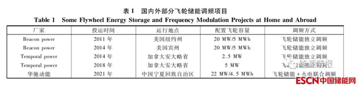 針對火力發(fā)電機組,由于大部分火電廠均承擔(dān)調(diào)頻任務(wù),而火電機組調(diào)頻存在遲滯性、超調(diào)、欠調(diào)、反調(diào)等問題,并且在反復(fù)調(diào)頻過程中,會對火電機組內(nèi)的機械系統(tǒng)的壽命造成影響,這就會導(dǎo)致電網(wǎng)頻率的調(diào)節(jié)效果受到影響。利用飛輪儲能的快速響應(yīng)特點結(jié)合鋰離子電池大容量儲能特點,可以很好地完成火電機組調(diào)頻工作,使得火電機組調(diào)頻更加穩(wěn)定并且能夠接受連續(xù)調(diào)頻作業(yè)。美國 Beacon Power 公司在紐約州建設(shè)飛輪調(diào)頻電站,總?cè)萘?20 MW,該電站于 2011 年投運,由飛輪陣列、升壓系統(tǒng)、控制系統(tǒng)、冷卻系統(tǒng)等組成,可以承擔(dān)該地區(qū) 23% 左右的調(diào)頻能力,調(diào)頻準(zhǔn)確率在 90% 以上。近幾年國內(nèi)也開始出現(xiàn)了飛輪儲能參與電網(wǎng)調(diào)頻的示范項目,表 1 統(tǒng)計了部分國內(nèi)外飛輪儲能調(diào)頻項目情況。