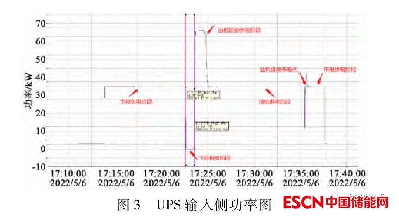 實際使用效果如圖 3 所示,市電出現(xiàn)中斷時,由飛輪儲能產(chǎn)品放電,并立即向柴油發(fā)電機發(fā)送啟動信號,柴油發(fā)電機啟動后,經(jīng)過一定時間達到穩(wěn)定輸出狀態(tài),檢測到柴油發(fā)電機輸出功率穩(wěn)定后,由 ATS 自動將負載轉(zhuǎn)移至柴油發(fā)電機供電,整個切換過程中,輸出端將持續(xù)保持穩(wěn)定。