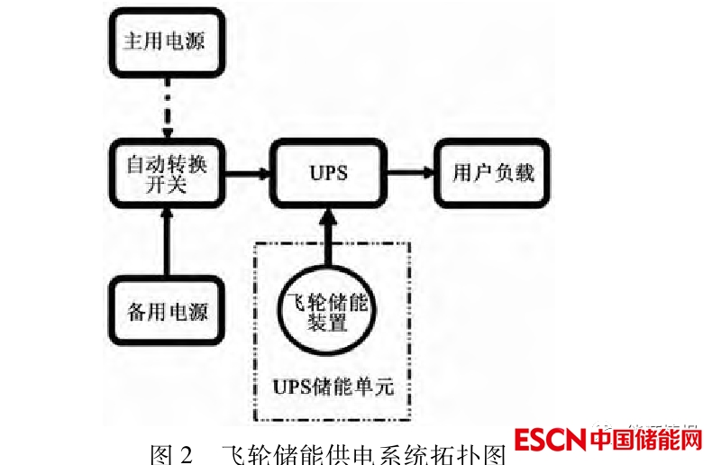 飛輪儲能供電系統(tǒng)拓撲圖如圖 2 所示,利用柴油發(fā)電機組、飛輪儲能 UPS、切換開關(guān)( ATS) 等關(guān)鍵設(shè)備,在市電出現(xiàn)波動或中斷時,將主用電源無縫地切換到備用電源。
