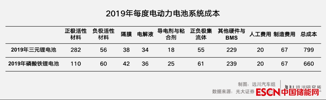 根據(jù)光大證券在2019年測算的數(shù)據(jù),當時生產(chǎn)1kWh三元鋰電池正極材料成本在300元左右,磷酸鐵鋰電池正極材料成本為110元,隔膜和電解液的成本一共在70元左右,對應容量的三元鋰電池系統(tǒng)總物料成本在800元左右,磷酸鐵鋰電池系統(tǒng)不到650元[4]。