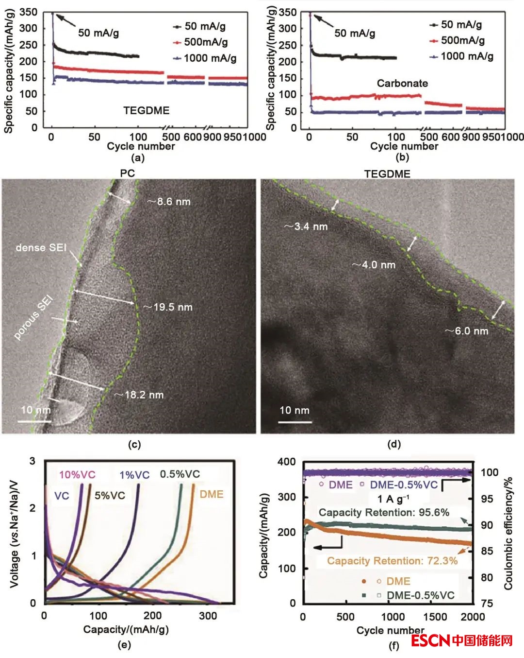 針對(duì)硬碳材料本身的改性得到大量研究,但硬碳材料所面臨的首次庫(kù)侖效率和倍率性能問(wèn)題無(wú)法同時(shí)得到改善。而電解液的分解是硬碳首次庫(kù)侖效率低的主要原因,因此,優(yōu)化電解液是提高首次庫(kù)侖效率的有效方法。醚類電解液因其與碳基材料有良好的相容性而得到廣泛研究。理想的SEI膜應(yīng)是較薄且穩(wěn)定,即初始循環(huán)消耗的電解質(zhì)和堿離子較少,一旦SEI膜形成,它將作為鈍化層,在連續(xù)的循環(huán)中防止電解質(zhì)和堿離子的進(jìn)一步消耗。醚類電解液相比于酯類電解質(zhì)在負(fù)極表面能生成更薄更穩(wěn)定的SEI膜。Seh等首次報(bào)道了一種簡(jiǎn)單的醚基電解質(zhì)六氟磷酸鈉,在沒(méi)有任何添加劑和對(duì)陰極材料進(jìn)行表面涂層情況下,300次循環(huán)中實(shí)現(xiàn)99.9%的高平均庫(kù)侖效率,歸因于醚類電解質(zhì)在陰極上誘導(dǎo)形成均勻SEI膜。Xiao等研究顯示四甘醇二甲醚(TEGDME)和碳酸鹽電解質(zhì)中的硬碳在低電流密度(50 mA/g)容量及容量保持率相差不大,但硬碳在1000 mA/g電流密度下測(cè)試時(shí),在TEGDME中的比容量約為150 mAh/g,是碳酸鹽中值(50 mAh/g)的3倍,進(jìn)行1000次循環(huán)容量保持率約為85%,而在碳酸鹽中為70.2%[圖7(a)、(b)],歸因于硬碳在TEGDME電解液中形成更薄且更穩(wěn)定的SEI膜。同樣,Hirsh等[41]在探討硬碳在常規(guī)碳酸鹽電解質(zhì)和高性能醚基電解質(zhì)中的性能和機(jī)制差異中表明,在醚基電解質(zhì)中可實(shí)現(xiàn)更高的首次庫(kù)侖效率、更高的倍率性能和優(yōu)異的循環(huán)性能。同時(shí),通過(guò)低溫透射電鏡、SEM、EDS和XPS以三種不同的速率探索了SEI的形成,結(jié)果顯示,在醚基電解液中生成更薄、更穩(wěn)定、更均勻的SEI膜[圖7(c)、(d)],使硬碳在不同電流密度下具有優(yōu)異的電化學(xué)性能。Dong等使用制備的硬碳納米球報(bào)道了醚基電解質(zhì)中獨(dú)特的溶劑化鈉和鈉共嵌入機(jī)制,這種獨(dú)特的機(jī)制避免了緩慢的去溶劑化過(guò)程,從而增強(qiáng)了鈉的儲(chǔ)存動(dòng)力學(xué)。此外,通過(guò)低溫透射電鏡和深度剖析X射線電子能譜,觀察到在醚基電解質(zhì)中形成具有高無(wú)機(jī)比例的薄SEI膜,溶劑化鈉在醚電解質(zhì)中的較高擴(kuò)散系數(shù)以及具有較低界面阻抗的較薄SEI膜進(jìn)一步增強(qiáng)了動(dòng)力學(xué)。醚基電解質(zhì)的貢獻(xiàn),使得半電池具有優(yōu)異的倍率性能(10 A/g電流密度下比容量為214 mAh/g,具有120 mAh/g的超高平臺(tái)容量)和高首次庫(kù)侖效率(1 A/g電流密度下為84.93%)。普遍認(rèn)為,低結(jié)晶度、高孔隙率和大表面積的碳質(zhì)材料通常具有較高的放電能力,但由于表面SEI不完全且不穩(wěn)定,它們存在超低ICE的嚴(yán)重問(wèn)題。Zhang等報(bào)道了幾種不同的高表面積硬碳材料,通過(guò)使用醚基電解質(zhì)改善了首次庫(kù)侖效率。其中還原氧化石墨烯,其首次庫(kù)侖效率可高達(dá)74.6%,并伴隨著509 mAh/g的高可逆比容量,其歸因于在醚基電解質(zhì)中形成的薄而緊湊的均勻和離子傳導(dǎo)的SEI膜。Chen等合成的具有高表面積的介孔空心碳球,在醚基電解質(zhì)中20 A/g電流密度下具有187.6 mAh/g可逆容量,同時(shí)具有86.2%的高首次庫(kù)侖效率。通過(guò)分子動(dòng)力學(xué)模擬和分子表面靜電勢(shì)計(jì)算表明,這種電解質(zhì)能夠增強(qiáng)溶劑化鈉傳輸動(dòng)力學(xué),并在碳陽(yáng)極表面具有適當(dāng)?shù)撵o電相互作用。電解液的濃度同樣對(duì)鈉離子電池性能有很大的影響,可通過(guò)控制電解液濃度進(jìn)行硬碳材料性能的優(yōu)化。Jin等報(bào)道了一種用于高度可逆的鈉離子電池的不易燃的局部高濃度電解質(zhì),通過(guò)使用低溫透射電子顯微鏡,發(fā)現(xiàn)在電極表面形成超薄(3 nm)和穩(wěn)定的界面層。硬碳表面上形成的富含無(wú)機(jī)物的固體電解質(zhì)界面最大限度地減少了硬碳與電解質(zhì)之間的不良反應(yīng),實(shí)現(xiàn)了高達(dá)97.8%首次庫(kù)侖效率。Li等提出了一種超低濃度鈉離子電池電解質(zhì),不僅降低了成本而且擴(kuò)大工作溫度范圍,低黏度和較小的腐蝕風(fēng)險(xiǎn)(較少的HF侵蝕)將有助于提高低溫和高溫下的界面潤(rùn)濕性和庫(kù)侖效率。此外,形成的具有優(yōu)異動(dòng)力學(xué)的穩(wěn)定的SEI/CEI使鈉離子電池在極端溫度下穩(wěn)定運(yùn)行。添加電解質(zhì)添加劑作為SEI膜的成膜劑,亦是改善鈉離子電池性能的有效方法。Bai等通過(guò)加入少量的酯類添加劑作為SEI成膜添加劑添加到醚類電解質(zhì)中,在硬碳電極材料上構(gòu)建保護(hù)層。在添加少量酯類添加劑的電解質(zhì)(DME-0.5%VC)中,初始容量為211 mAh/g的硬碳負(fù)極在1 A/g的高電流密度下進(jìn)行2000次循環(huán),容量保持率高達(dá)95.6%,在未添加酯類添加劑的電解液(DME)中容量保持率僅有72.3%[圖7(f)]。首次庫(kù)侖效率從純DME基電解質(zhì)的84.7%下降到DME-0.5%VC電解質(zhì)的83%[圖7(e)]。這歸因于VC輔助SEI薄膜的逐漸形成,在接下來(lái)的循環(huán)中,DME-0.5%VC電解質(zhì)中的庫(kù)侖效率達(dá)到近100%,表明VC輔助的SEI薄膜在長(zhǎng)循環(huán)期間穩(wěn)定地維持電化學(xué)可逆性。