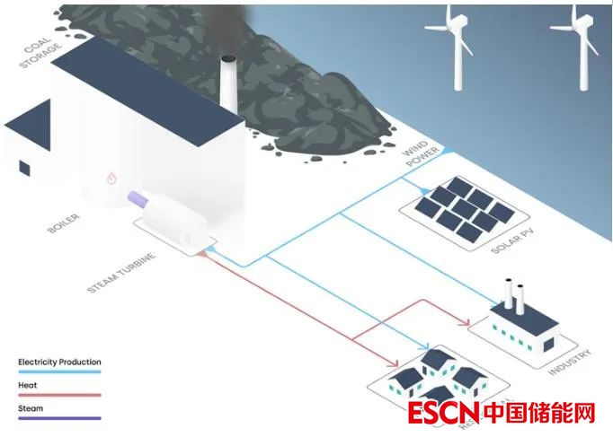 這兩個儲罐能夠以700攝氏度的溫度將電能以熱能的形式儲存。更高的溫度為如何提取能量提供了很大的靈活性,包括朗肯循環(huán)熱電聯(lián)產(chǎn)、布雷頓循環(huán)熱能發(fā)電、儲熱用于區(qū)域供熱和工業(yè)供熱。