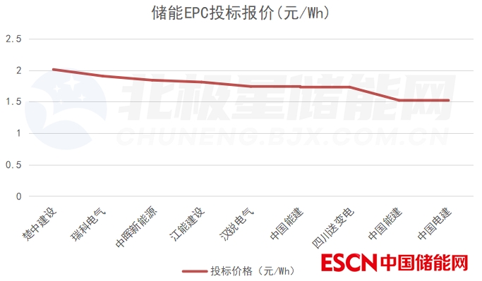 儲能EPC投標報價最低的是中國電建華東院,投標價為1.51元/Wh。投標項目是國家能源集團寧東復合光伏基地配套100MW/200MWh儲能電站EPC。最終,中國能建中電工程西北電力設計院預中標,中標價格1.52元/Wh。