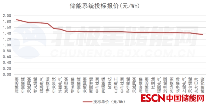 儲能系統(tǒng)投標報價最低的為威勝電氣,投標價1.36元/Wh,中標的項目是中國電建湖北潛江市漁洋100MW漁光互補集中式共享儲能設備采購,該工程建設1座50MW/100MWh磷酸鐵鋰電池儲能站。
