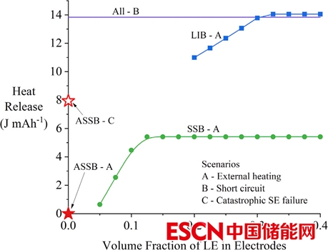 情形一,外部加熱引發(fā)熱失控。當(dāng)通過外部熱源引發(fā)熱失控時,添加少量液態(tài)電解質(zhì)的固態(tài)電池比全固態(tài)電池釋放出更多的熱量,但比常規(guī)液態(tài)鋰離子電池產(chǎn)生的熱量少。顯然,外部加熱下,在全固態(tài)電池中LLZO能夠更有效的隔離電池中的正負(fù)極;對于添加了少量的液態(tài)電解質(zhì)的固態(tài)電池,外部加熱時正極材料生成的O2很容易與少量的液態(tài)電解質(zhì)發(fā)生反應(yīng)釋放熱量。情形二,內(nèi)部短路引發(fā)熱失控。當(dāng)電池內(nèi)部短路引發(fā)熱失控時,三種類型的電池,常規(guī)液態(tài)鋰離子電池、添加少量電解質(zhì)的固態(tài)電池和全固態(tài)電池釋放熱量相同,表明當(dāng)電池內(nèi)部因枝晶引起內(nèi)短路并引發(fā)熱失控時固態(tài)電池并沒有優(yōu)勢。情形三,機(jī)械濫用引發(fā)熱失控。在全固態(tài)電池中,極端機(jī)械濫用(如針刺)條件下,全固態(tài)電池中的固態(tài)電解質(zhì)并不能很好的阻隔氧氣與負(fù)極的接觸,負(fù)極與氧反應(yīng)放出大量的熱。