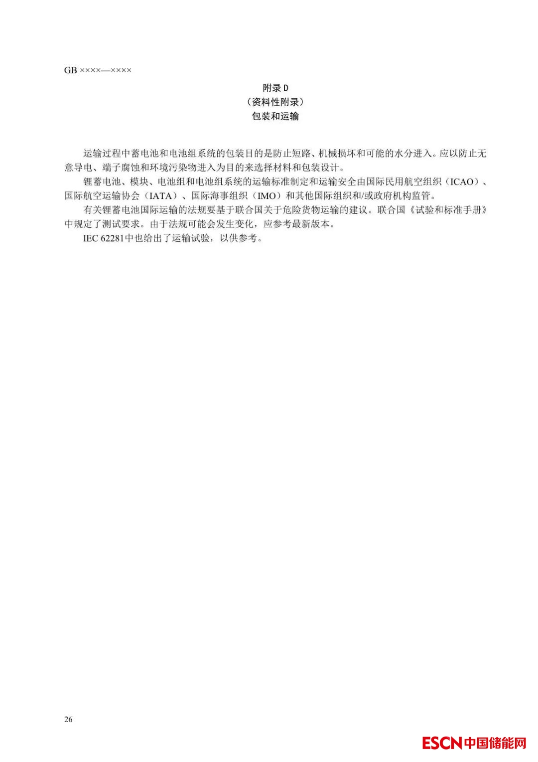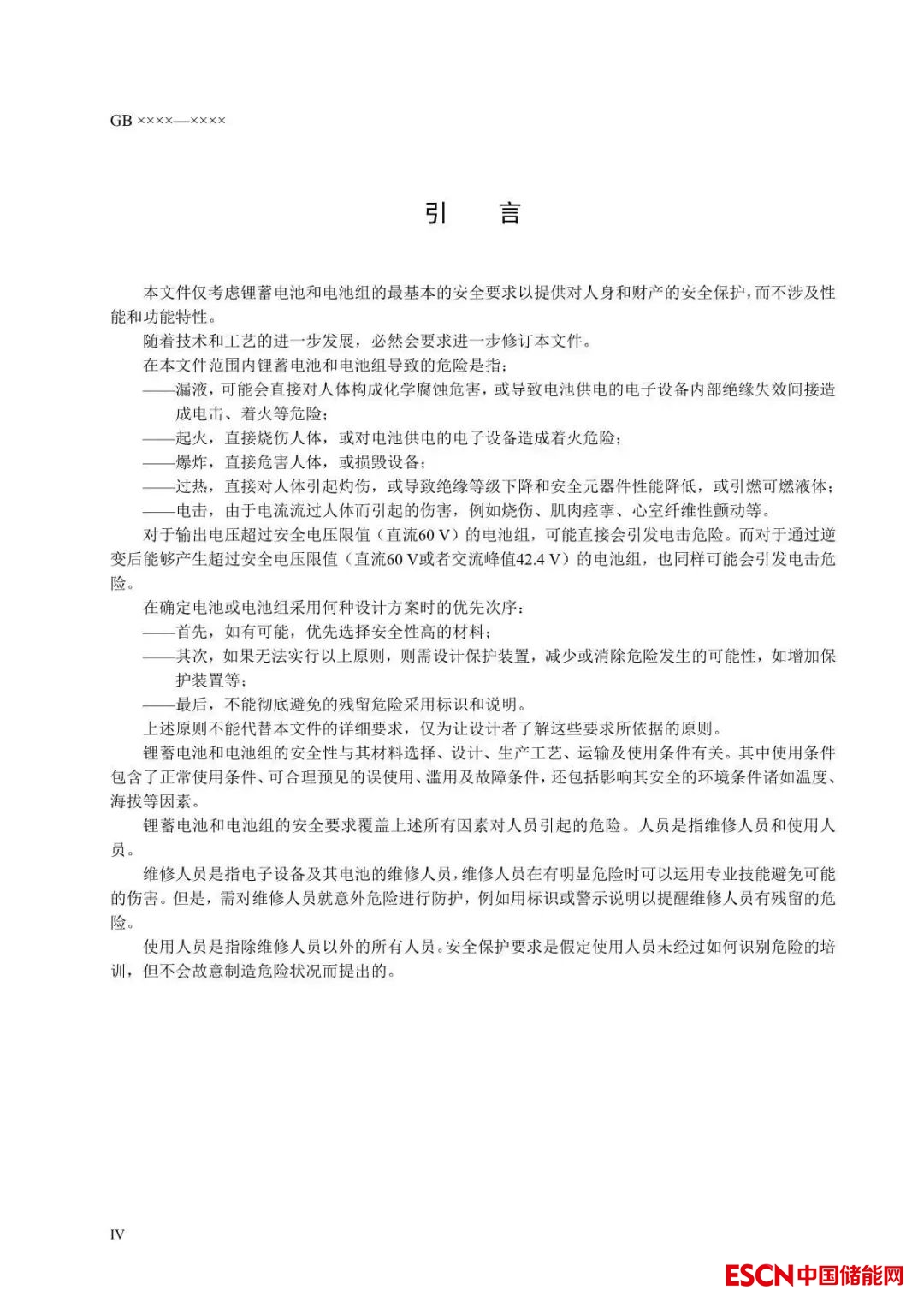 該文件適用于電能存儲系統(tǒng)用鋰蓄電池和電池組(以下簡稱為電池和電池組)。其中電能存儲系統(tǒng)包括:電信;中央應急照明和報警系統(tǒng);固定式發(fā)動機啟動;光伏系統(tǒng);家用(住宅)儲能系統(tǒng)(HESS);大容量儲能:并網(wǎng)/離網(wǎng)。