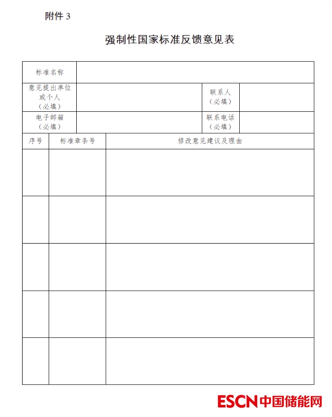 如有不同意見,請在公示期間填寫《強制性國家標準反饋意見表》(見附件3),通過電子郵件發(fā)送至KJBZ@miit.gov.cn(郵件主題注明:《電能存儲系統(tǒng)用鋰蓄電池和電池組安全要求》等3項強制性國家標準征求意見稿公示反饋)。