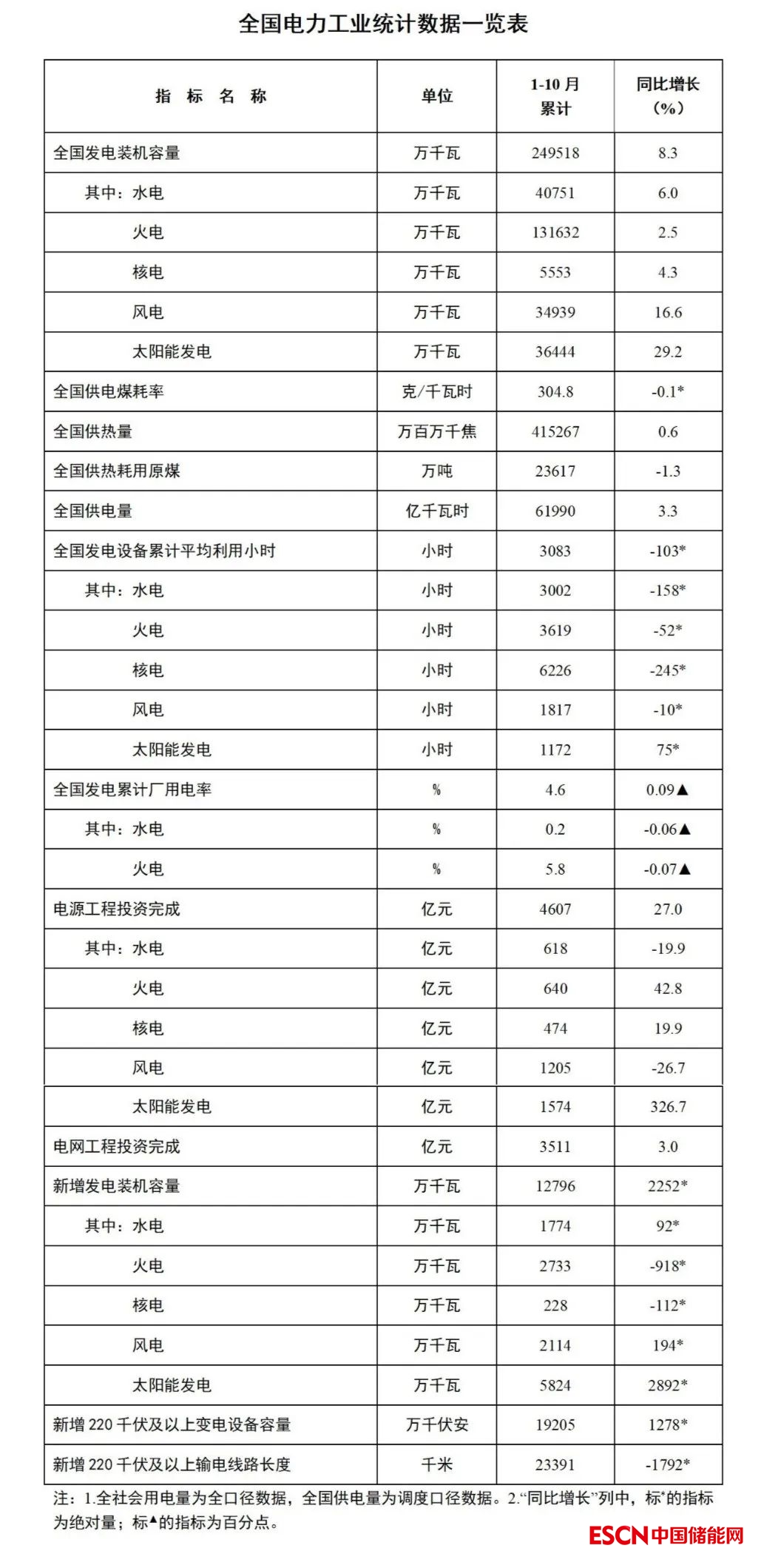 中國儲能網(wǎng)訊:11月22日,國家能源局發(fā)布1-10月份全國電力工業(yè)統(tǒng)計(jì)數(shù)據(jù)。