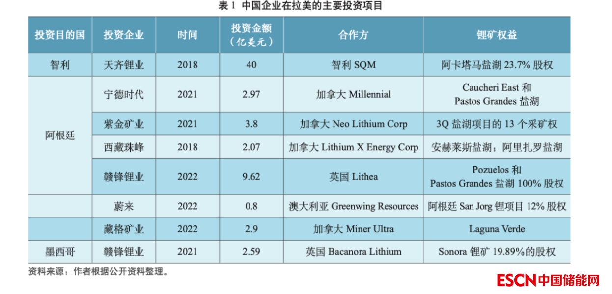 據(jù)美國《地緣政治監(jiān)測》網(wǎng)報道,從 2018年到2020年,中國在南美鋰三角的采礦項目投資約160億美元。中國對拉美鋰礦投資形式多為股權(quán)并購,投資目的國主要集中在智利、阿根廷和墨西哥。2018 年天齊鋰業(yè)以 40 億美元收購了智利鋰礦企業(yè),智利礦業(yè)化工(SQM)23.7%的股份,是近年中企最大的一筆鋰礦投資。阿根廷是投資項目和投資額最多的國家。由于受玻利維亞國內(nèi)因素的制約,中國對玻利維亞鋰礦投資進(jìn)展緩慢。2022 年末,玻利維亞將舉行首次鋰礦開采的公私合作招標(biāo),有 4 家中國公司入圍。表 1 是中國在拉美的主要鋰礦投資項目情況。