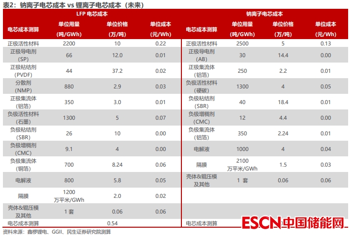 未來隨著碳酸鋰價格回落,鈉離子電池產(chǎn)業(yè)鏈成熟。假設(shè)碳酸鋰價格未來降低到 25 萬/噸左右,根據(jù)鑫欏鋰電,25 萬/噸的碳酸鋰對應(yīng)磷酸鐵鋰正極價格約10 萬/噸,鈉離子電池方面,我們假設(shè)鈉離子電池正極、負(fù)極產(chǎn)業(yè)鏈成熟后成本可降低 50%,根據(jù)測算,未來碳酸鋰價格回落, 鈉離子電池產(chǎn)業(yè)鏈成熟后,磷酸鐵鋰電芯的成本約 0.54 元/Wh,鈉離子電芯的成本約 0.33 元/Wh,鈉離子電芯成本低于磷酸鐵鋰電芯 0.21 元/Wh。