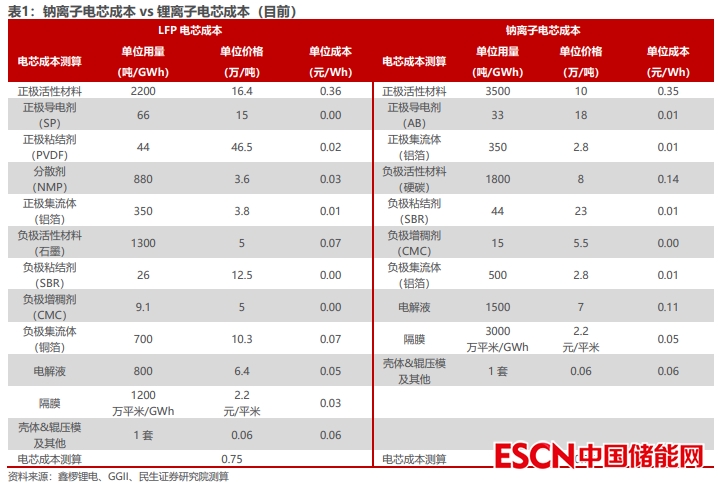 目前碳酸鋰價格高企,鈉離子電池尚未規(guī)?;a(chǎn),磷酸鐵鋰電芯的成本在0.75 元/Wh,鈉離子電芯的成本在 0.75 元/Wh,兩者基本持平。