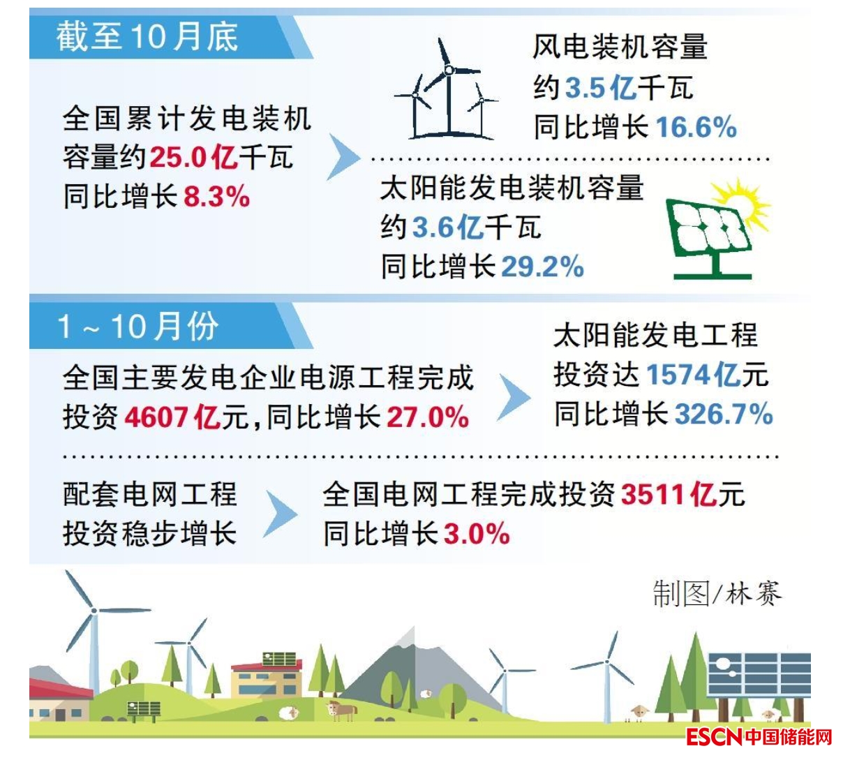 中國(guó)儲(chǔ)能網(wǎng)訊:從國(guó)家能源局網(wǎng)站獲悉,日前,國(guó)家能源局發(fā)布1~10月份全國(guó)電力工業(yè)統(tǒng)計(jì)數(shù)據(jù)。截至10月底,全國(guó)累計(jì)發(fā)電裝機(jī)容量約25.0億千瓦,同比增長(zhǎng)8.3%。其中,風(fēng)電裝機(jī)容量約3.5億千瓦,同比增長(zhǎng)16.6%;太陽(yáng)能發(fā)電裝機(jī)容量約3.6億千瓦,同比增長(zhǎng)29.2%。以上數(shù)據(jù)顯示,我國(guó)風(fēng)電、太陽(yáng)能發(fā)電等新能源發(fā)展勢(shì)頭強(qiáng)勁,裝機(jī)規(guī)模保持快速增長(zhǎng),為我國(guó)經(jīng)濟(jì)社會(huì)發(fā)展提供了綠色動(dòng)能。
