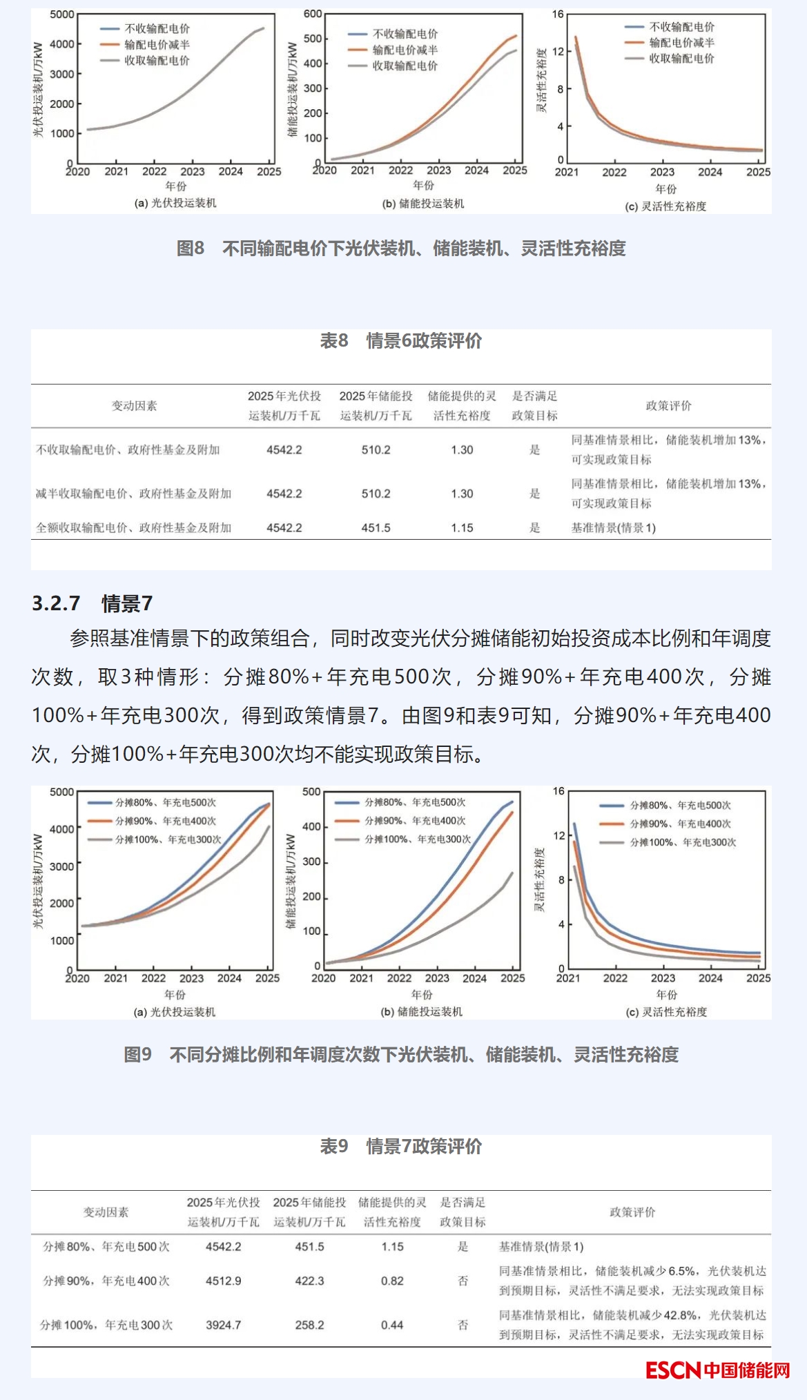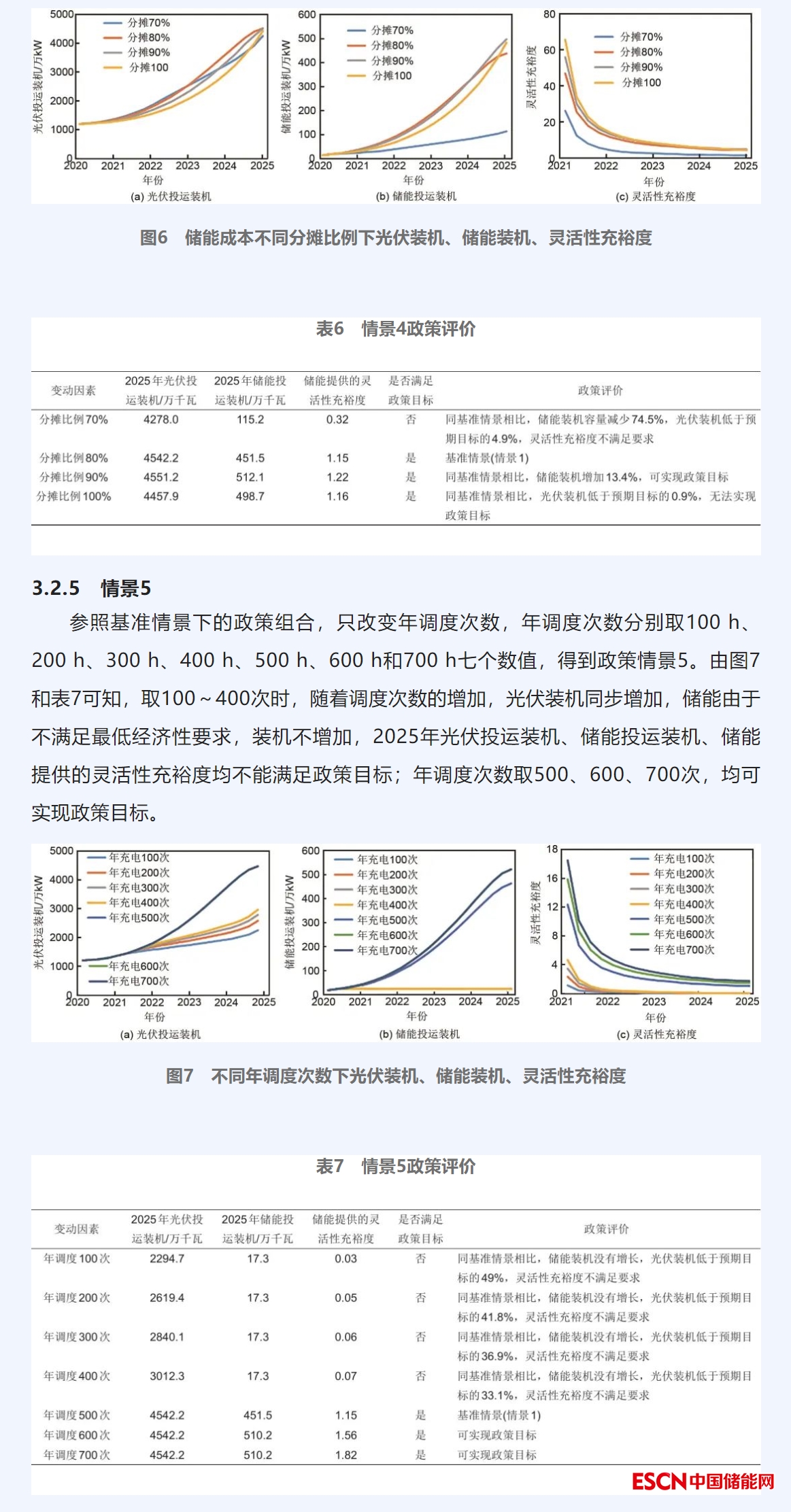 由以上仿真結(jié)果表明,該省當(dāng)前的政策強(qiáng)度可實(shí)現(xiàn)既定的政策目標(biāo),即2025年光伏裝機(jī)達(dá)到4500萬(wàn)kW以上且儲(chǔ)能提供的靈活性充裕度使光伏棄電率滿(mǎn)足不超過(guò)5%。由情景2、3的政策評(píng)價(jià)結(jié)果可知,只改變配儲(chǔ)比例、配儲(chǔ)時(shí)長(zhǎng),均無(wú)法實(shí)現(xiàn)政策目標(biāo);由情景4、5、7的政策評(píng)價(jià)結(jié)果可知,制定合適的分?jǐn)偙壤?、保證一定的年調(diào)度次數(shù)是實(shí)現(xiàn)政策目標(biāo)的關(guān)鍵,儲(chǔ)能通過(guò)光伏分?jǐn)傄欢ū壤某跏纪顿Y、提高年調(diào)度次數(shù)回收成本,實(shí)際上反映的是對(duì)儲(chǔ)能容量和能量時(shí)移兩方面價(jià)值的認(rèn)可。