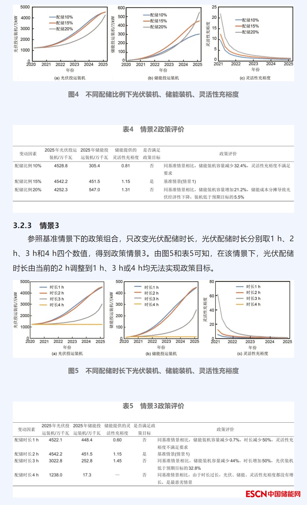 圖3為基準(zhǔn)情景(情景1)下,2020—2025年光伏投運(yùn)裝機(jī)、儲(chǔ)能投運(yùn)裝機(jī)、儲(chǔ)能提供的靈活性充裕度。在該情景下,2025年光伏投運(yùn)裝機(jī)為4542.2萬(wàn)千瓦,儲(chǔ)能投運(yùn)裝機(jī)為451.5萬(wàn)千瓦,儲(chǔ)能提供的靈活性充裕度不小于1(由儲(chǔ)能靈活性充裕度公式可知,小于1意味著新增儲(chǔ)能提供的靈活性不能滿(mǎn)足新增光伏棄電率不高于5%要求)。由政策合理性的評(píng)價(jià)標(biāo)準(zhǔn)可知,基準(zhǔn)情景下光伏投運(yùn)裝機(jī)、儲(chǔ)能提供的靈活性充裕度達(dá)到設(shè)定的目標(biāo)。