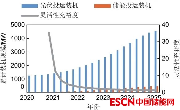 圖3 基準(zhǔn)情景下光伏裝機(jī)、儲(chǔ)能裝機(jī)、靈活性充裕度