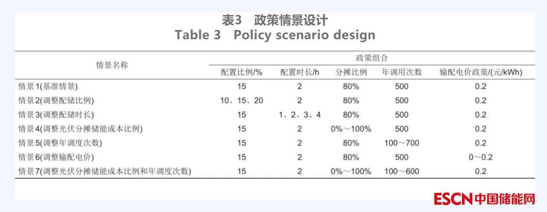 將該省當(dāng)前執(zhí)行的政策設(shè)定為基準(zhǔn)情景(情景1),在基準(zhǔn)情景的基礎(chǔ)上,改變配儲(chǔ)比例、配儲(chǔ)時(shí)長(zhǎng)、光伏分?jǐn)們?chǔ)能成本比例、年調(diào)度次數(shù)、輸配電價(jià)等單個(gè)因素,分別得到一系列其他政策情景(情景2~情景6),同時(shí)調(diào)整光伏分?jǐn)們?chǔ)能成本比例和年調(diào)度次數(shù),得到組合情景7。