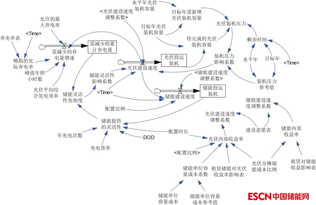 (1)明確問(wèn)題,確定系統(tǒng)邊界:為解決風(fēng)、光等新能源快速發(fā)展和電力系統(tǒng)調(diào)節(jié)能力不足之間的矛盾,在新型儲(chǔ)能成本高、無(wú)成熟商業(yè)模式的背景下,需合理制定配儲(chǔ)比例、配儲(chǔ)時(shí)長(zhǎng)、成本分?jǐn)偙壤认嚓P(guān)政策,以加快形成以?xún)?chǔ)能和調(diào)峰能力為基礎(chǔ)支撐的新增電力裝機(jī)發(fā)展機(jī)制。本模型中,模擬的時(shí)間范圍為2021—2025年,關(guān)鍵變量為光伏累計(jì)裝機(jī)、儲(chǔ)能累計(jì)裝機(jī)、需減少的累計(jì)棄電量。