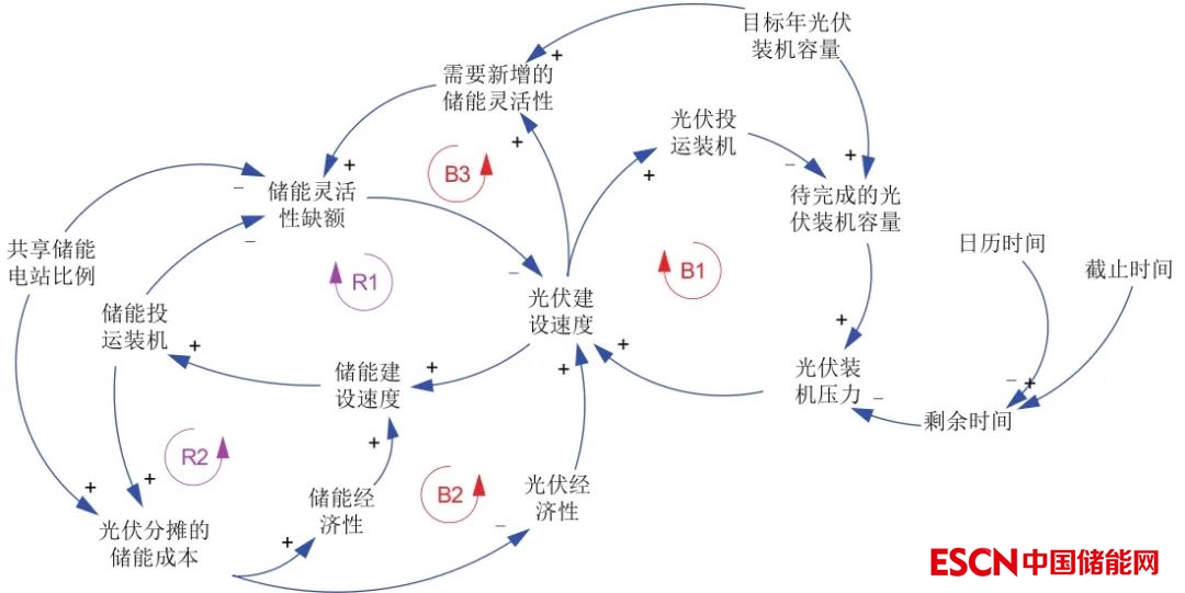 正反饋回路R2:儲(chǔ)能建設(shè)速度增加→儲(chǔ)能投運(yùn)裝機(jī)增加→需要光伏分?jǐn)偟膬?chǔ)能成本增加→儲(chǔ)能經(jīng)濟(jì)性增加→儲(chǔ)能建設(shè)速度增加。
