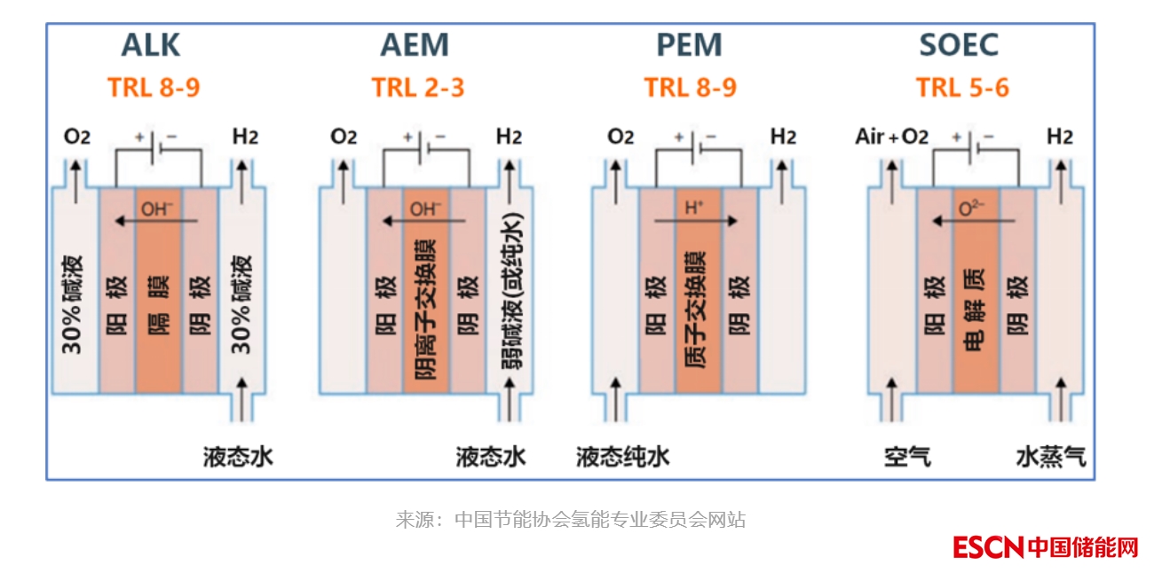 結(jié)合市場(chǎng)現(xiàn)狀,當(dāng)前主流技術(shù)有以下四種:堿性電解水(ALK)、質(zhì)子交換膜電解水(PEM)、固體氧化物電解水(SOEC)和陰離子交換膜電解水(AEM)。