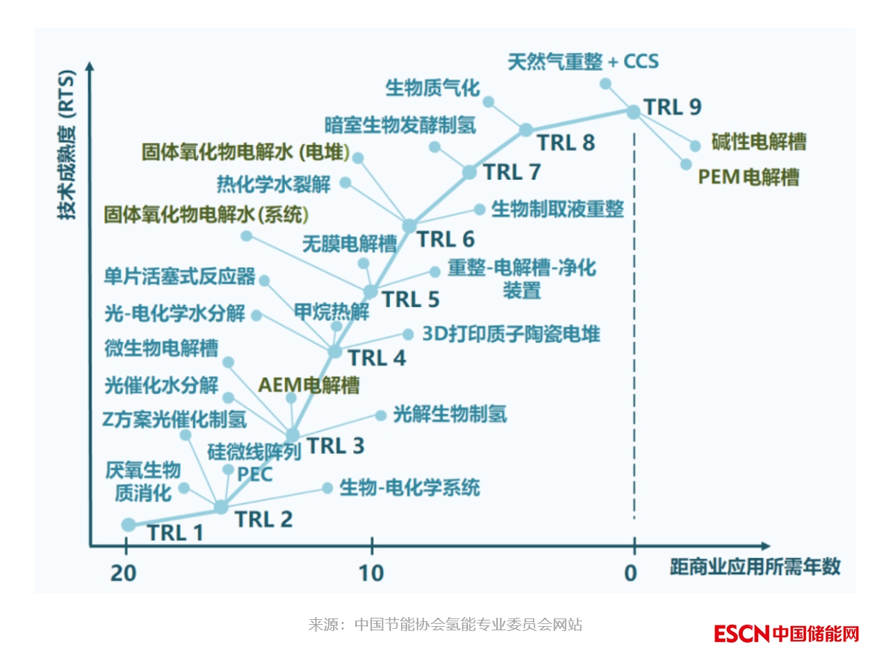 但電解水制氫若想在數(shù)據(jù)中心實(shí)現(xiàn)規(guī)?;瘧?yīng)用,離不開(kāi)技術(shù)成熟度(Technology Readiness Level,TRL)的不斷提高,簡(jiǎn)單說(shuō),技術(shù)成熟度越高,市場(chǎng)需求越大,規(guī)模化滿足后成本將會(huì)出現(xiàn)大幅下降,經(jīng)濟(jì)性獲得大幅提升,市場(chǎng)空間才會(huì)被徹底打開(kāi)。
