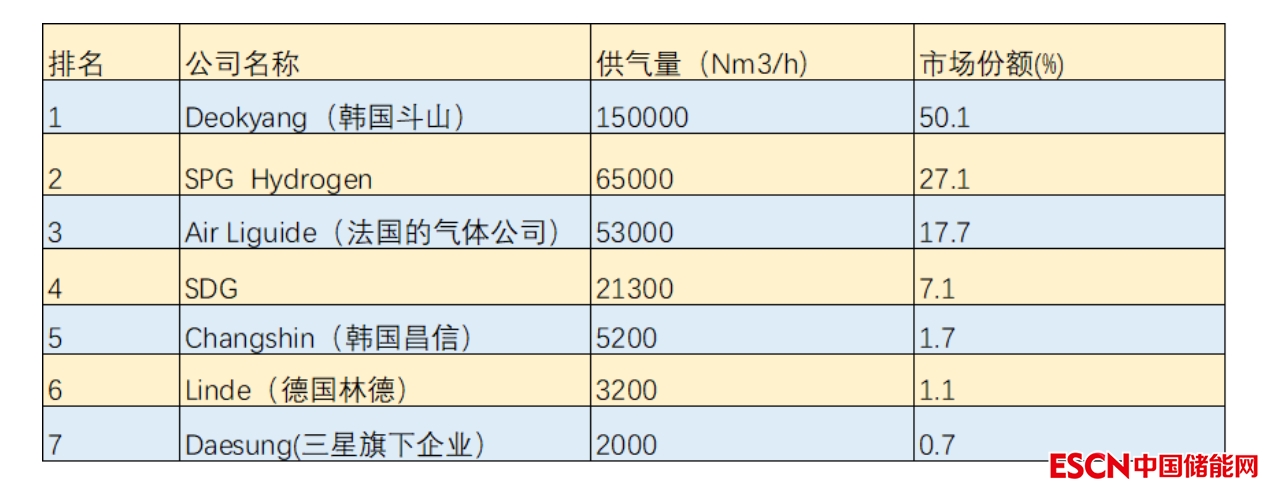 氫氣供應(yīng)方面,韓國(guó)擁有三大石化綜合體,各有一家大型煉油廠:1)蔚山(SK Energy和S Oil),2)Yeosu(GS Caltex),和3)Seosan/Daesan(現(xiàn)代Oilbank)。大約90%是當(dāng)?shù)氐臍錃馍a(chǎn)作為副產(chǎn)品分配給客戶的,其中,斗山是韓國(guó)最大的氫氣供應(yīng)商。