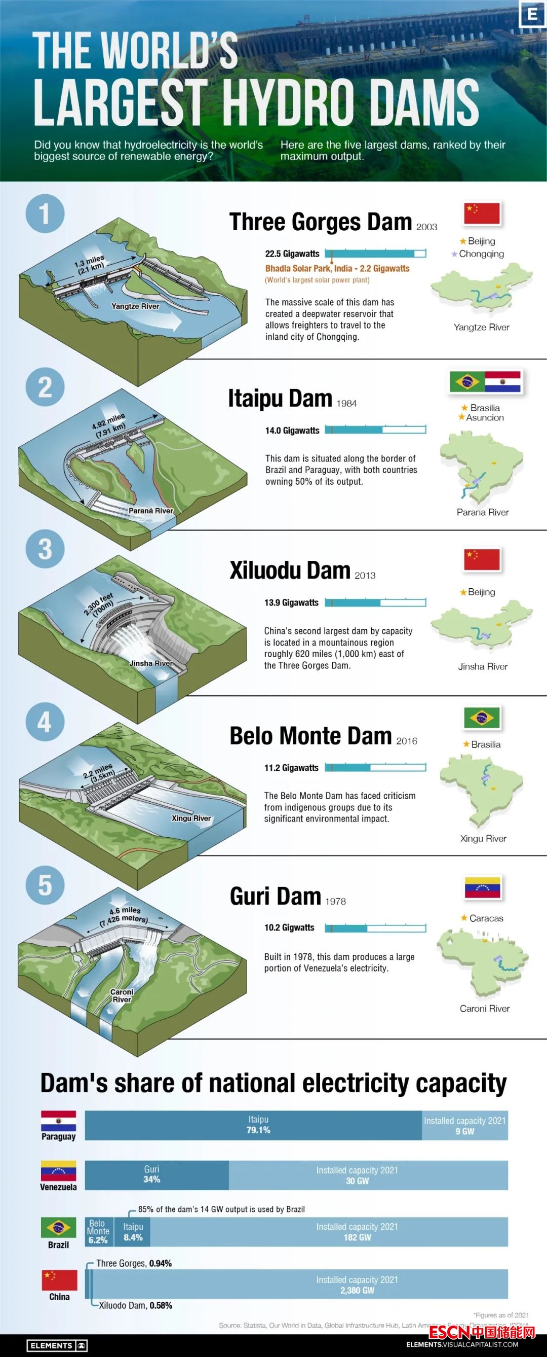 Virtual Capitalist網(wǎng)站發(fā)表信息圖顯示全球五座水電大壩的關(guān)鍵信息。位居榜首的是2003年啟用的中國三峽大壩,其裝機(jī)容量為22.5吉瓦,接近第二名伊泰普大壩的兩倍。就年產(chǎn)量而言,三峽與伊泰普大壩的實(shí)際發(fā)電量大致相同。這是因?yàn)榘屠呛拥募竟?jié)變化很小,這意味著全年的流量變化很小,而長江一年中有幾個月的流量大幅下降。三峽大壩是全球工程奇跡,建造成本超過320億美元。三峽水庫水庫面積1045平方公里,這個水庫的質(zhì)量足以使地球自轉(zhuǎn)減慢0.06微秒。