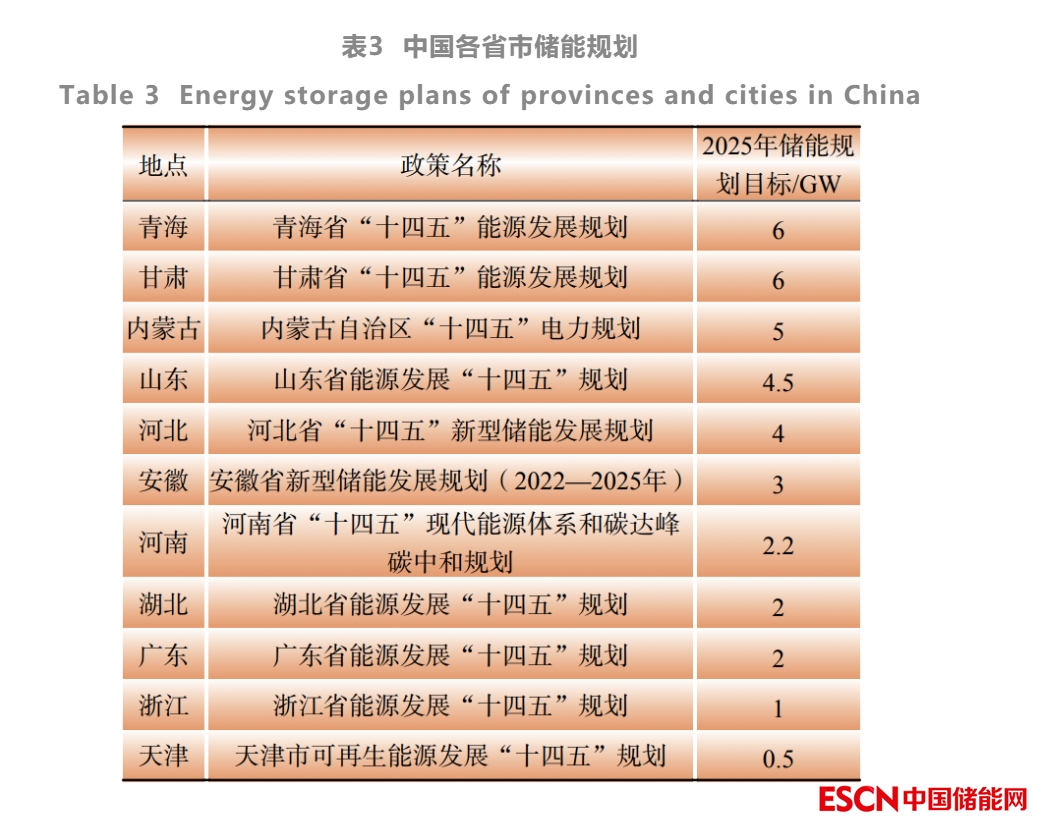 在儲(chǔ)能發(fā)展規(guī)劃層面,湖北、浙江、廣東、安徽、河北、內(nèi)蒙古等省市明確提出儲(chǔ)能規(guī)劃,如表3所示,到2025年新型儲(chǔ)能裝機(jī)共計(jì)39.7 GW。其中青海、甘肅儲(chǔ)能規(guī)模最大,2025年新型儲(chǔ)能預(yù)計(jì)裝機(jī)6 GW。