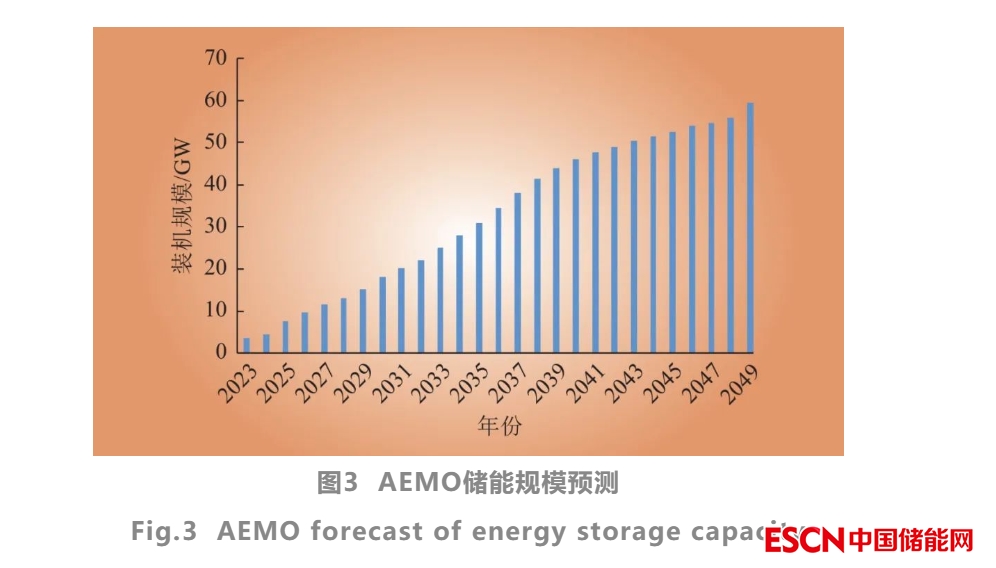 2021年12月,澳大利亞能源市場運(yùn)營機(jī)構(gòu)(AEMO)發(fā)布2022年綜合能源計(jì)劃(ISP2022),計(jì)劃到2049年儲(chǔ)能規(guī)模接近60 GW,預(yù)測規(guī)模如圖3所示[24]。其中,戶用型儲(chǔ)能(含光儲(chǔ))占比70%,大型電池儲(chǔ)能占比20%,抽蓄等其他儲(chǔ)能占比10%。