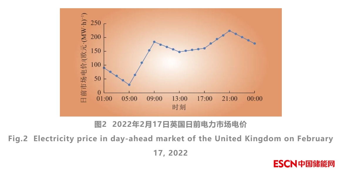 在峰谷套利方面,目前,英國日前市場的平均價(jià)差顯著提高,儲(chǔ)能價(jià)格不斷下降,獨(dú)立儲(chǔ)能或新能源配套儲(chǔ)能通過平衡單元等負(fù)荷聚合商參與日前市場和平衡市場,已基本具備盈利能力。2022年2月17日的英國日前市場電價(jià)如圖2所示,峰谷電價(jià)差達(dá)到200歐元/(MW·h),2 h和4 h儲(chǔ)能的平均峰谷套利價(jià)差為192歐元/(MW·h)、160歐元/(MW·h)左右。據(jù)測算分析,2、4 h儲(chǔ)能日均套利價(jià)差達(dá)到149歐元/(MW·h)(約合人民幣1.02元/(kW·h))、111歐元/(MW·h)(約合人民幣0.76元/(kW·h)),即可實(shí)現(xiàn)盈利(目標(biāo)杠桿回報(bào)率為10%)。