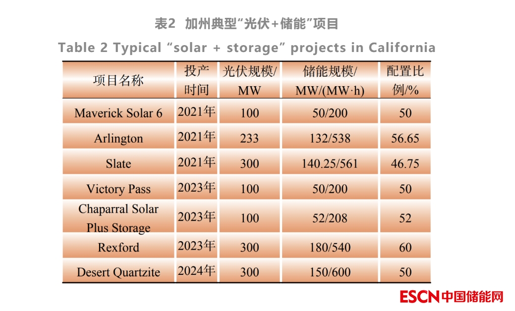 目前,為滿足新能源快速發(fā)展需求,加利福尼亞州正在積極部署“光伏+儲(chǔ)能”項(xiàng)目,如表2所示,儲(chǔ)能配置比例大多超過40%,充放電時(shí)長以4 h為主。