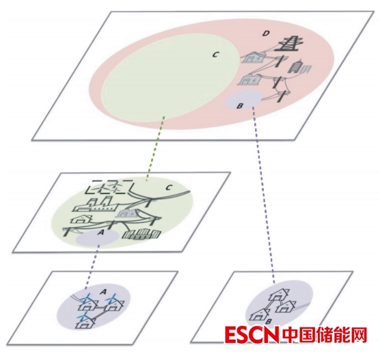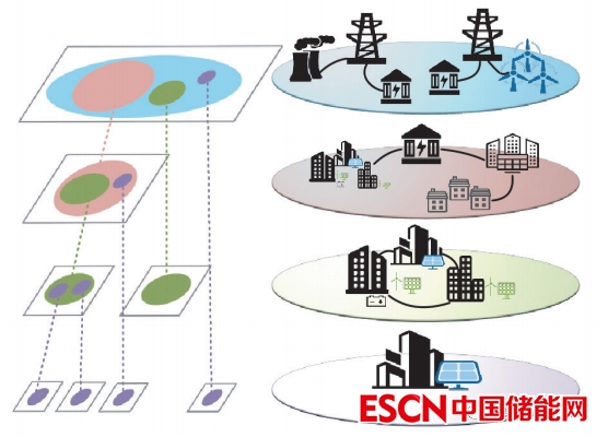 兩個(gè)集群不能有重疊,因?yàn)橐坏┯兄丿B會(huì)導(dǎo)致它們都無(wú)法維持自身的凈功率平衡。因此,兩個(gè)集群要么完全不重疊,要么一個(gè)集群完全包含于另一個(gè)集群,就像互聯(lián)網(wǎng)中的LAN被視為包含于ISP子網(wǎng)一樣(圖2)。一個(gè)集群可以包含多個(gè)集群,也可以不包含任何集群;作為一個(gè)更大集群的一部分,一個(gè)集群還可以包含幾個(gè)集群。這形成了群集的自然層次結(jié)構(gòu)(圖6),頂層是整個(gè)互聯(lián)電力系統(tǒng),下面的一層可以是一個(gè)作為互聯(lián)電力系統(tǒng)“控制區(qū)”運(yùn)行的擁有EMS的電力機(jī)構(gòu)或公司,最底層可能是一個(gè)智能住宅。
