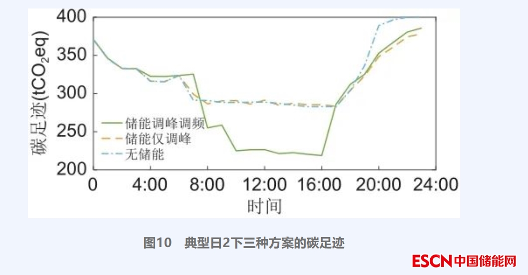 典型日2下3種方案的碳足跡如圖10所示,由式(24)可知,系統(tǒng)總碳足跡由火電、光伏和風(fēng)電出力共同決定,且火電碳足跡當(dāng)量值大幅高于光伏和風(fēng)電,可見火電機(jī)組出力對碳足跡有決定性的影響,圖7典型日2的凈負(fù)荷曲線與圖10曲線大致擬合,是因?yàn)榕渲脙?chǔ)能系統(tǒng)后,方案1的光伏、風(fēng)電出力占比提升,使總體碳足跡更低,間接說明了系統(tǒng)運(yùn)行產(chǎn)生的碳排放更少。